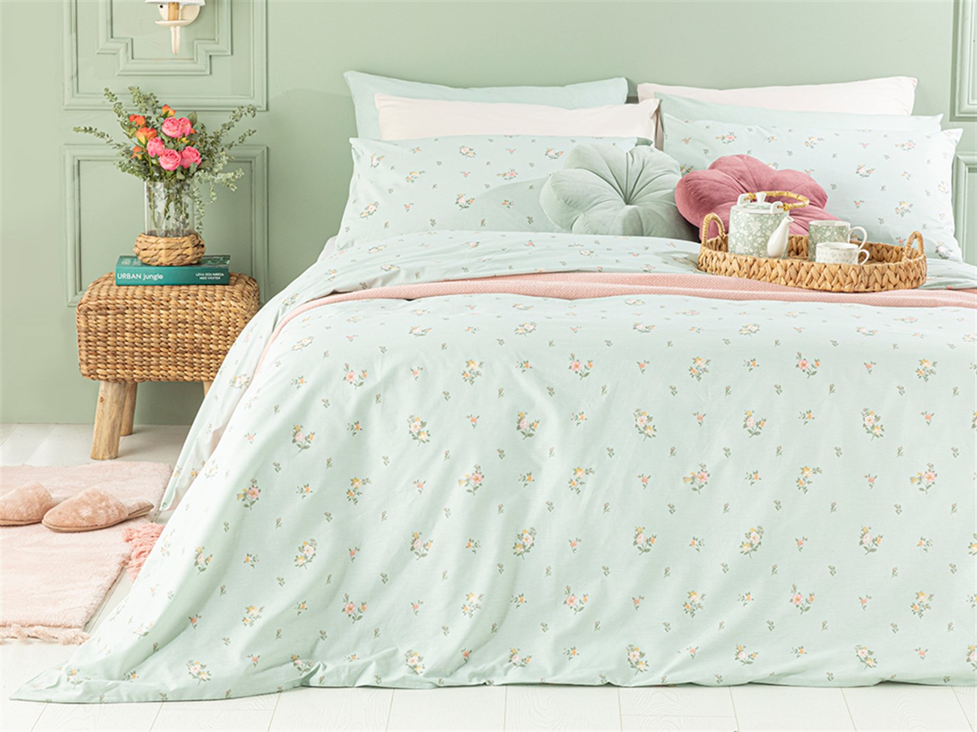 Pretty Flowers Cu Bumbac King Size Set Lenjerie De Pat 240x220 cm Seledon Deschis (000000010029846003)