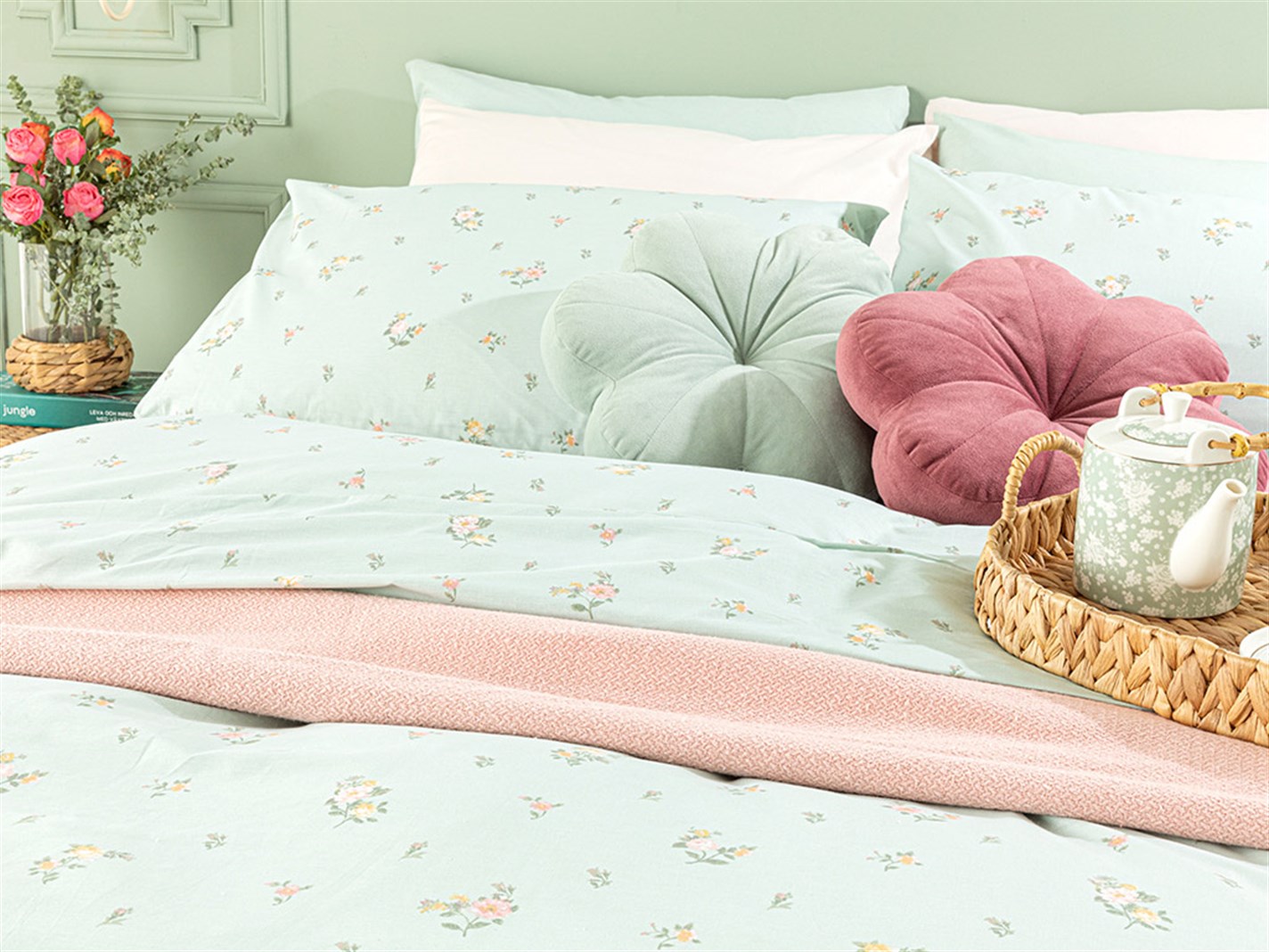 Pretty Flowers Cu Bumbac Super King Set Lenjerie De Pat 260x220 cm Seledon Deschis (000000010029846004)